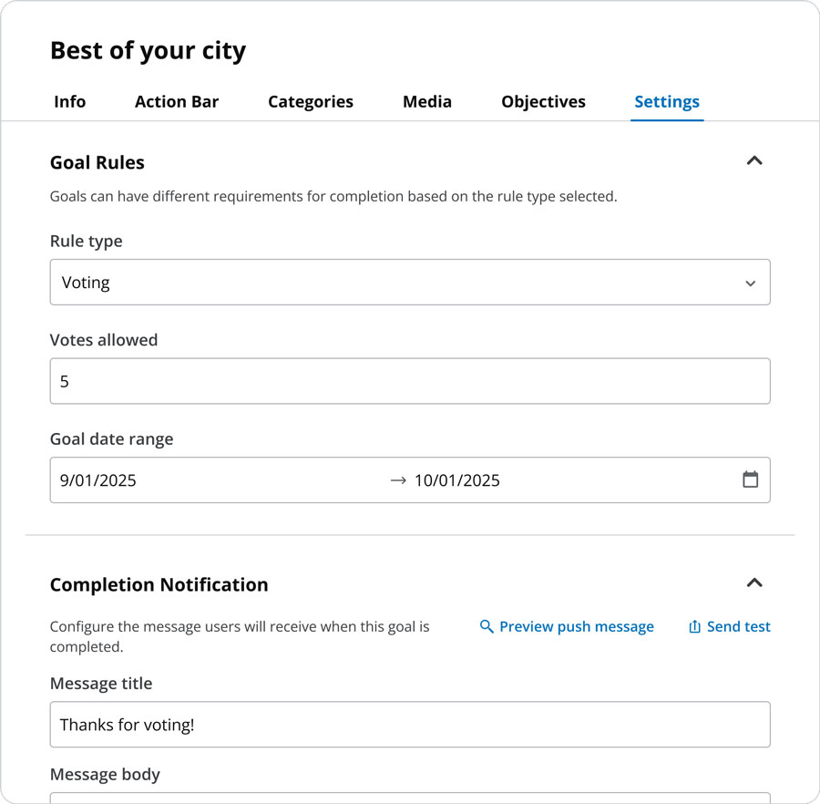 Time-Based Goals – Limited-time or seasonal goals to drive urgency and participation.