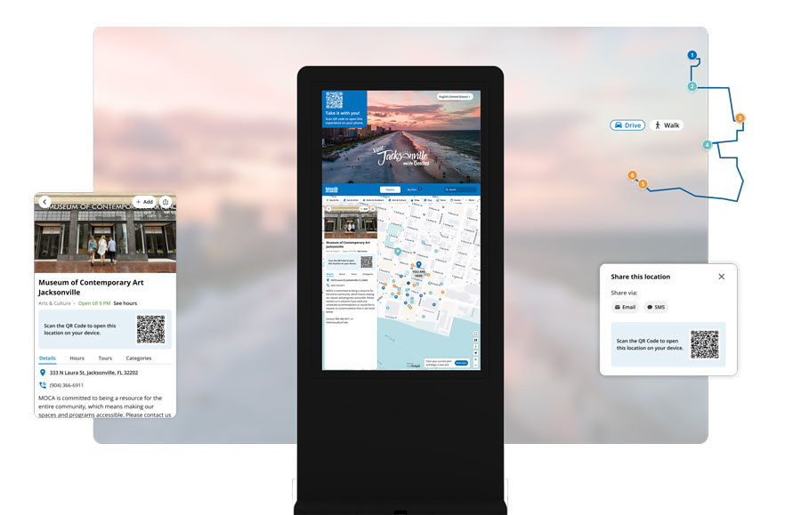 Visit Widget’s Interactive Kiosk Support provides an engaging and intuitive way-finding experience for visitors in-market looking for nearby attractions. Kiosks are configured based on the installation location, so people interacting with the device are immediately presented with attractions and POIs close to their current location.