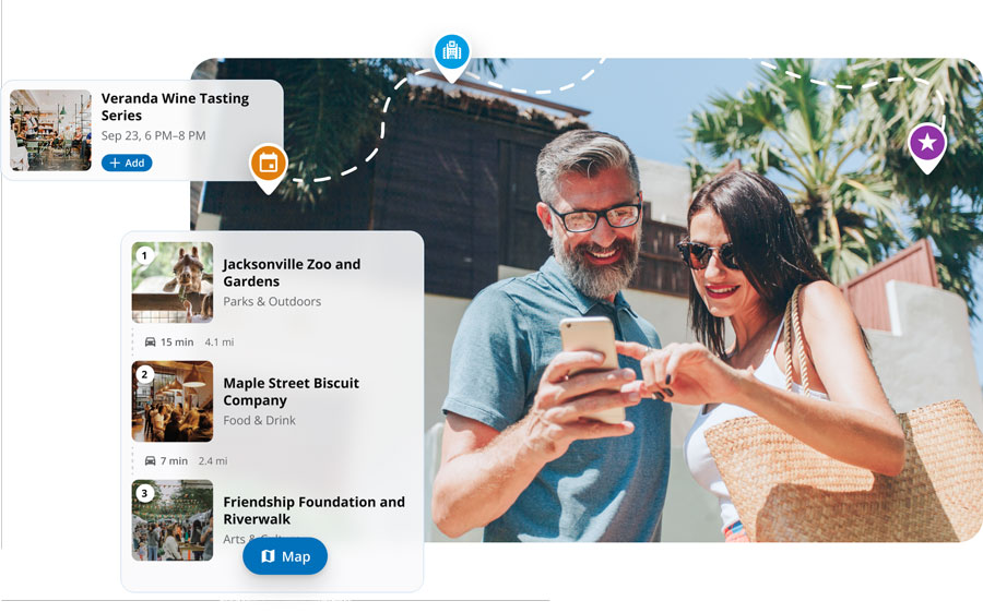 In today’s ever-connected world of information overload, the duty falls on DMOs to highlight local, authentic experiences in their destinations. Our platform provides the tools & technology to help visitors find what they are looking for, with minimal input, exactly when and where they are.